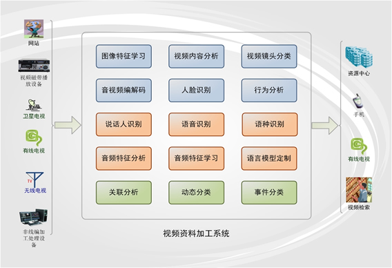 青岛巨媒软件工程有限公司研制的"新闻视频资料加工系统"采用了云计算系统结构,使用图像检索、图像聚类、声纹识别、面部识别等技术,实现了视频镜头分割、场景提取、说话人识别、语音识别、新闻事件提取等业务应用,为新闻视频资源的有效利用提供产品。